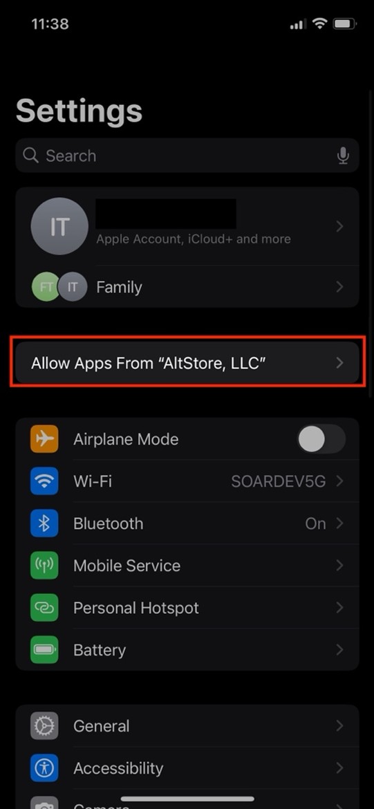 2. Open the Settings on your phone and there will be a new option, "Allow Marketplace From AltStore LLC" at the top under your Apple ID. Click on it.