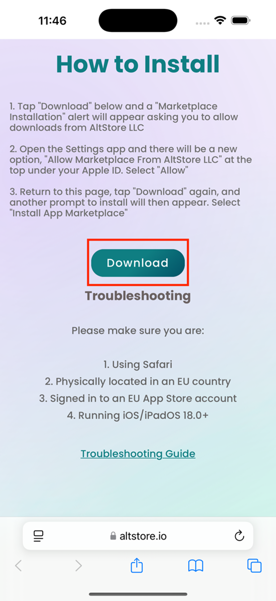 1. On your phone, open Safari and go to https://altstore.io/download and click on Download. Nothing will happen!