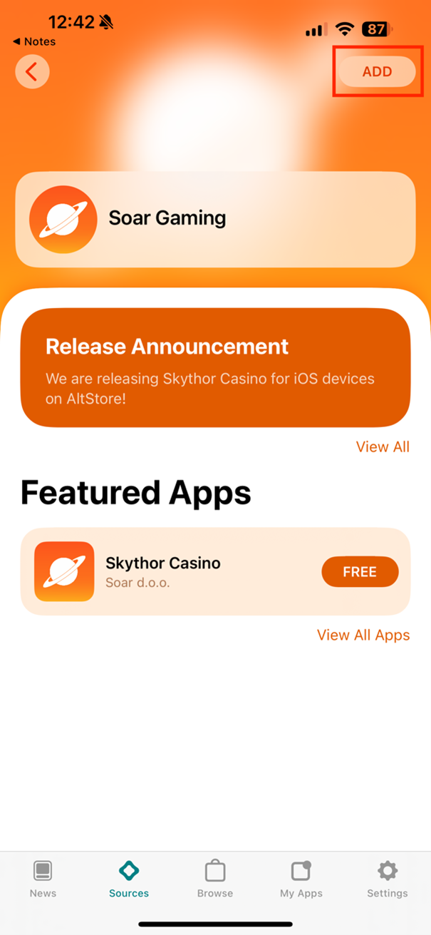 8. AltStore will open with the following screen. Click on Add in the upper right corner. Confirm by clicking Add Source.
